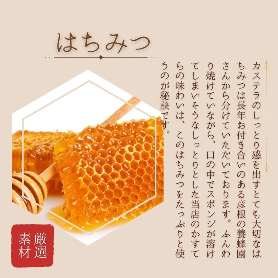 蜂蜜をたっぷりと用いた独特の味わいと、しっとりとした生地の食感がお子様にも人気があります。昔ながらの味ですので日本茶にもよく合います。 開国を訴えた井伊直弼公の城下町・彦根より、文明開化の時代を偲ばせる南蛮菓子「カステラ」をお届けいたします。