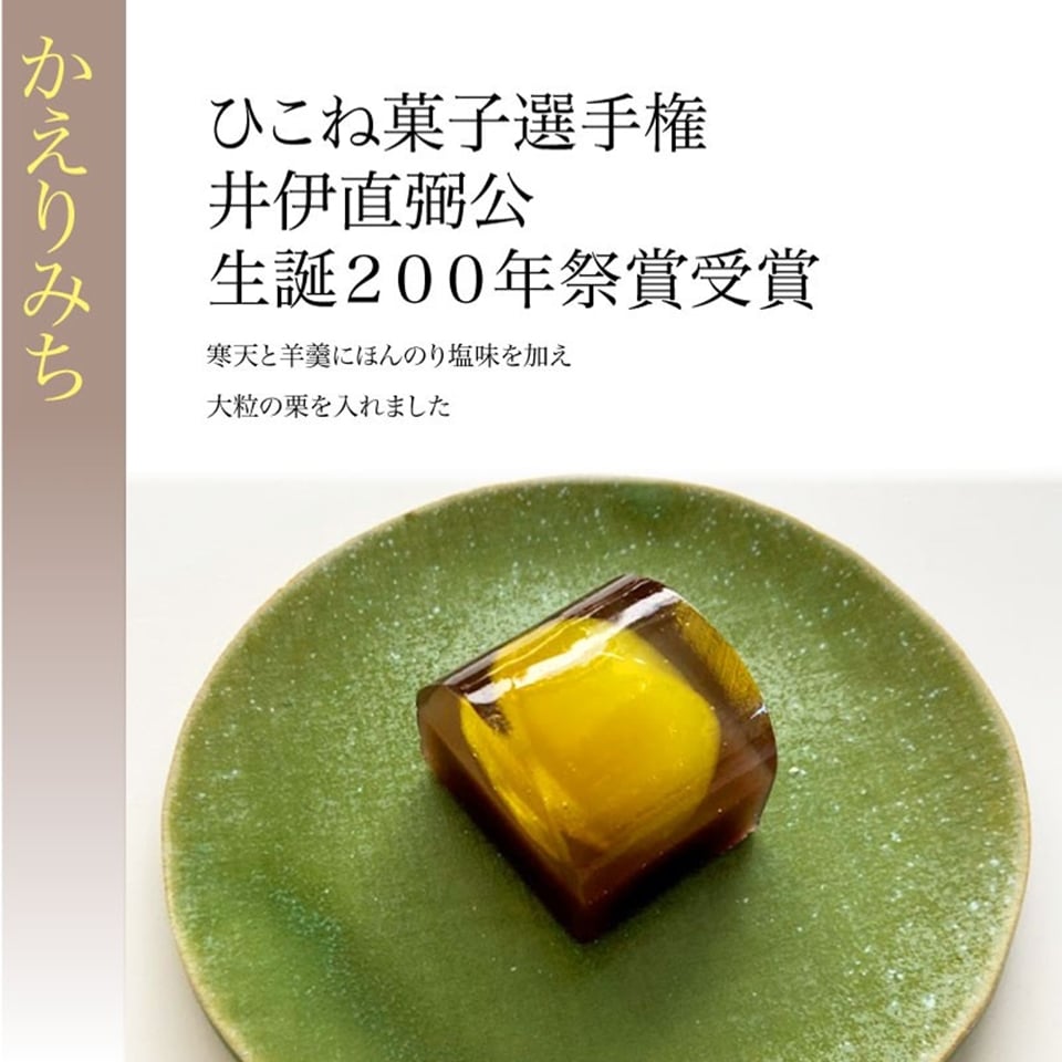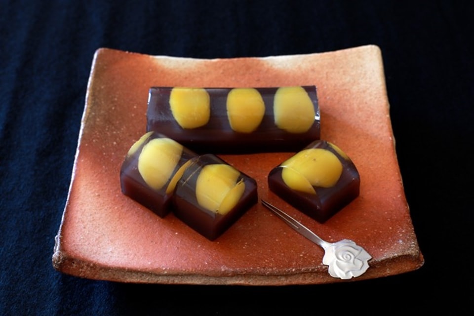 「かえりみち」は寒天と羊羹にほんのり塩味を加え、粒栗を入れてあります。茶会が終わり、主客ともに余情残心の中、足を進めたであろう庭園の庭石をイメージしています